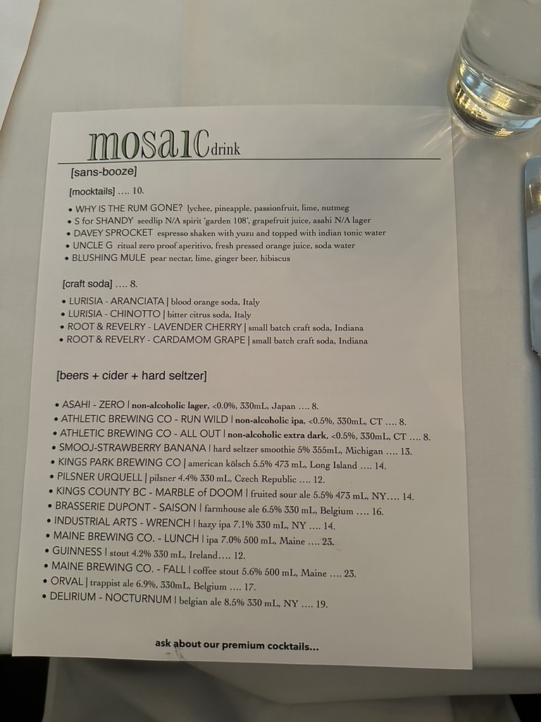 The menu at eatMOSAIC isn’t your typical dining experience; it’s a journey through a carefully curated selection of dishes. Highlights include the Lobster Au Poivre Vert, a sumptuous feast for the senses, and the Manhattan Lamb Chowder, which unfolds rich, comforting layers of flavor. If you're feeling adventurous, don’t miss the Beef Prime Rib "Pizzaiola", bursting with zest, or the uniquely crafted Linguini with White Lamb Sauce.