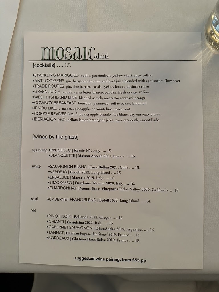 EatMOSAIC invites you to embrace each bite and sip as you embark on an extraordinary culinary adventure. Whether you're celebrating a special occasion or simply indulging in life’s pleasures, you owe it to yourself to experience the artistry that unfolds on each plate. Call +1 631-584-2058 to reserve your table and get ready for an evening where every detail has been crafted with love and skill.